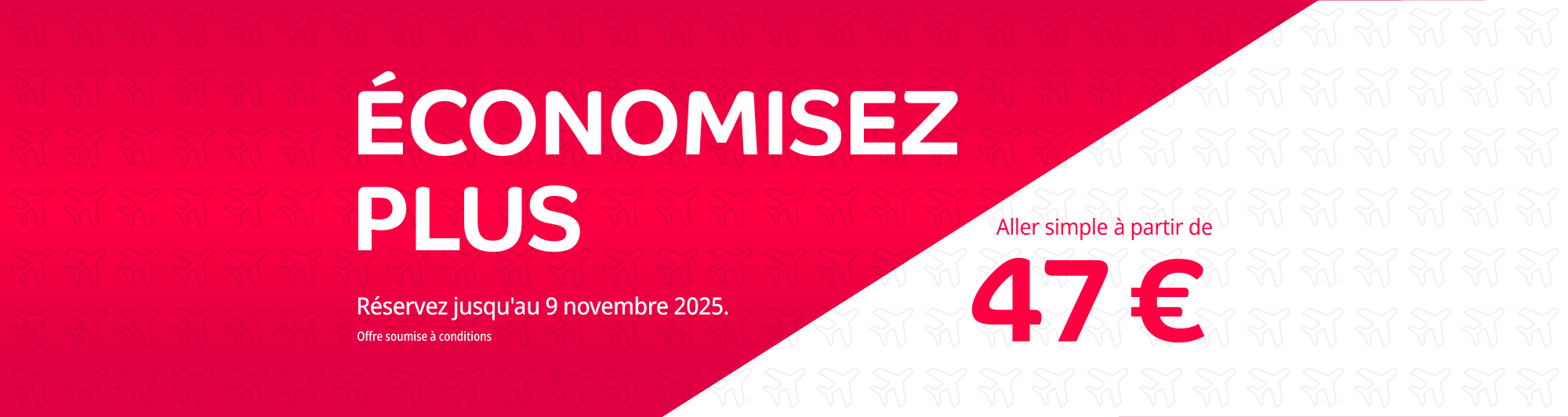 Profitez de notre promotion et envolez-vous depuis la France à partir de 47 € l’aller simple, toutes taxes comprises.